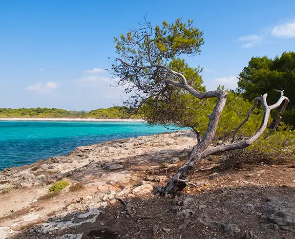 Glide east to Son Saura, where twin beaches—Es Talaier and Cala en Turqueta—unfurl like ribbon of powdered sugar. Search amberjack dashing across sunlight shallows while snorkel over fields of posidonia seagrass. After hiking to the Bronze Age stone fortification, Talaiot de Son Catlar, snack on formatjades (sweet cheese pastries) under the gnarled limbs of a carob tree.